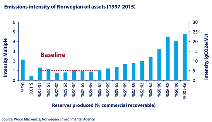 The general trend shows an elevated emissions intensity during production of the first 10% of reserves. This reduces as production ramps up and is flat throughout mid-life (10-50%). From 50% of production onward, the intensity of field emissions rises steadily to an average five times our baseline in the final 5% of production.