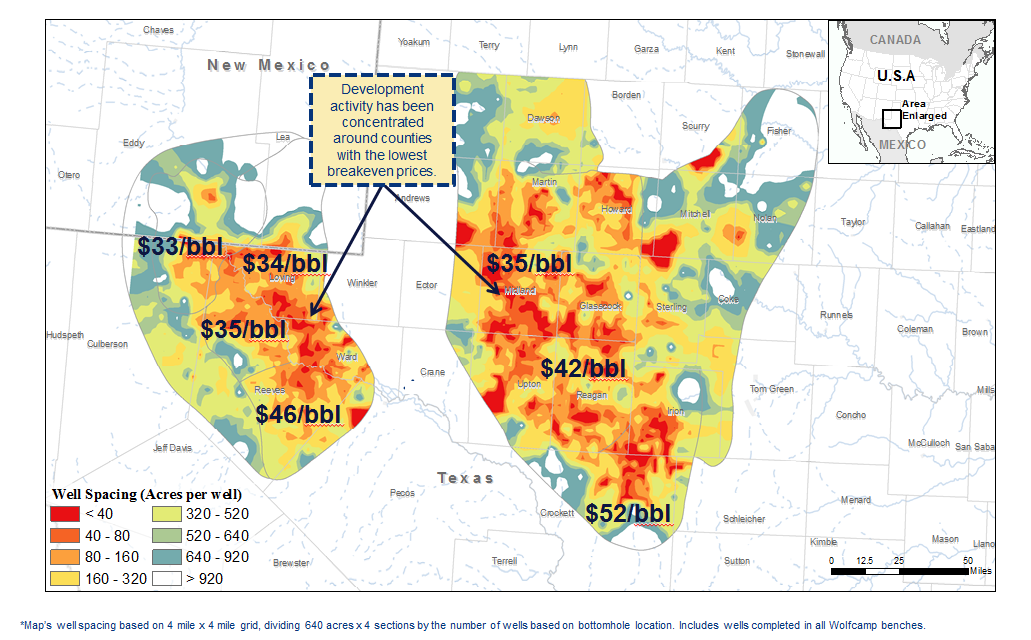 Economics is king. It's no surprise that activity to date has concentrated on counties with the lowest breakeven prices. However, if operators continue to drill up these areas, they will eventually need to switch to less developed areas with less favourable economics.