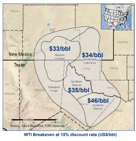 - There's still over eight years of drilling inventory economic under US$45/bbl. This accounts for 90% of locations in the play - substantially more than the 65% of locations that breakeven under US$45/ bbl in the Midland Wolfcamp.