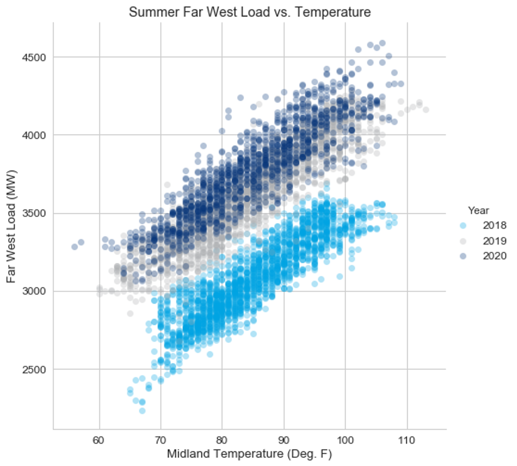 Within the past few years, increased oil and gas activity has resulted in an enormous amount of load growth. Figure 3 below shows that even with consistent temperatures, load in the Far West has continued to climb year-over-year. This expansive load growth has helped drive strong congestion in the Far West, especially around Pecos and Odessa. Additionally, the new solar builds previously mentioned (Oberon and Prospero Solar) were anticipated to put pressure on congestion in the Far West. However, transmission in the Far West has increased in transfer capacity and stability. Recently, Odessa-Wolf Switch-Moss Switch 345 kV was energized on June 15 and has killed off congestion around Odessa. Upgraded transmission between Andrews County and No Trees Switch was also energized earlier this year in April and have ended the Dollarhide-No Trees Switch congestion. We expect these upgrades to outweigh the congestion impacts from new solar builds planned through the rest of the summer, resulting in minimal upside to West LZ pricing.