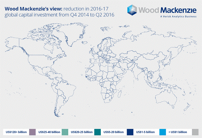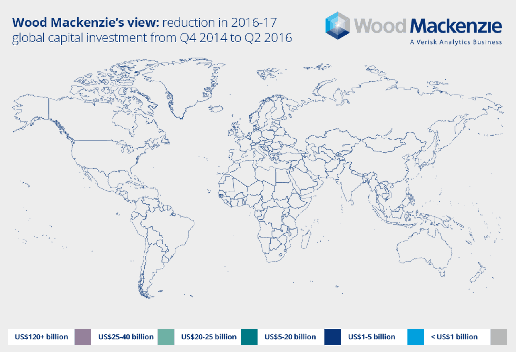 Although exploration investment has more than halved since 2014, and the figure is expected to be around US $42 billion per annum for 2016 and the same in 2017, costs have not been cut as much and as quickly as we expected. Some deepwater exploration spend has been protected by long rig contracts, but as these unwind we expect sharper cuts than in non-deepwater.