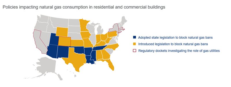 This is the first instance of a state law overturning local efforts, but won’t be the last. As of Q1 2021, more than 20 states have passed or proposed similar bills. While electric heating is the norm in many highlighted states below, these anti-electrification state efforts will slow down installations of efficient heat pumps and take away a crucial tool for municipalities.