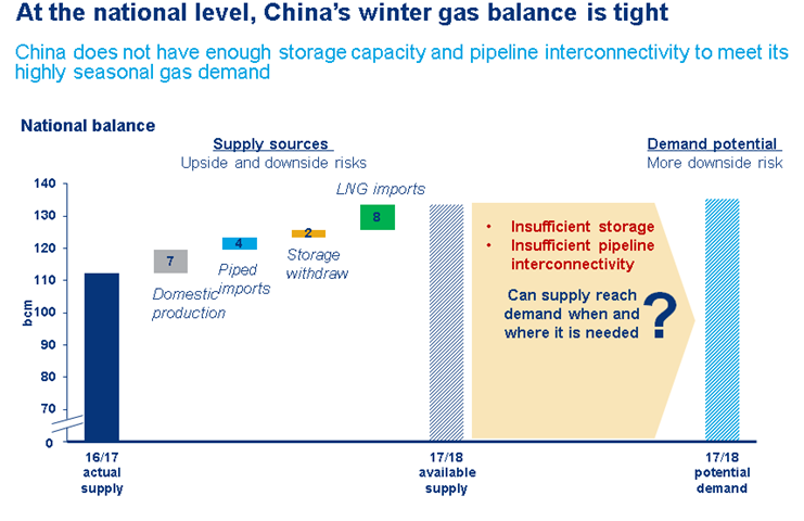 With new restrictions on the use of coal for heating in '2+26' cities and the industrial sector, China's gas demand is set to hit record highs this winter — growing by 23 bcm. The 2+26 policy alone will create 10 bcm of additional demand in Beijing-Tianjin-Hebei (BTH) and the surrounding areas, and industrial users that already switched to gas over the course of the year will continue to require gas in the winter months , increasing demand from 2016 levels. But will China have sufficient supplies?