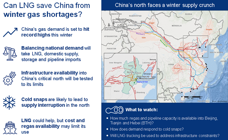 The uncertainties around LNG outlook will also affect LNG import prices. Regas capacity constraints in north China might limit LNG price upside in December to January. But a colder-than-normal end of the winter could further boost local LNG demand — and the global LNG price.