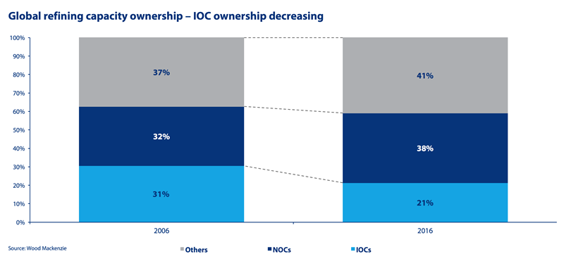 So who's doing the refining? International Oil Company (IOC) ownership of the global refining stock has fallen from around 30% in 2006 to now marginally above 20% — a drop of around 5 million barrels per day — with National Oil Companies and others picking up the baton.