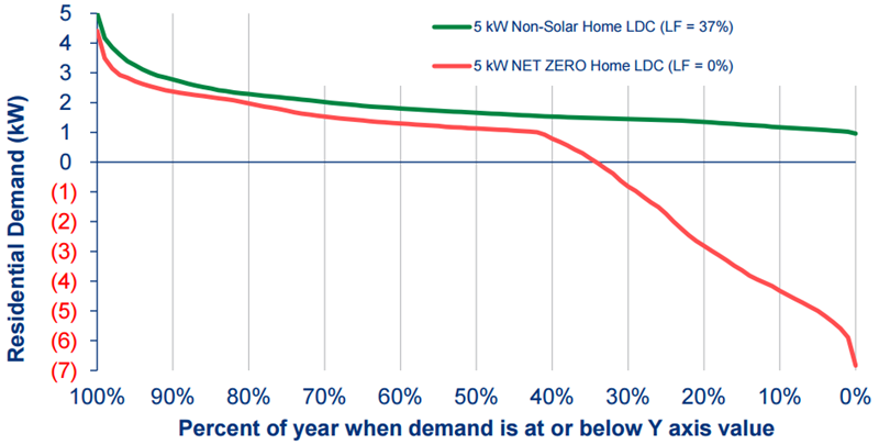The above chart shows the annual Load Duration Curves (LDC) of both the non-solar home and the Net Zero home. Notice that the non-solar home has an annual load factor (LF) of 37%, representing the ratio of average demand divided by the 5 kW peak demand. The chart also shows that the hourly peak demand for the Net Zero home is only about 12% lower than the non-solar home. This reflects the times during the summer when the Net Zero home is running its air conditioner after the sun goes down. During about 35% of the year, the Net Zero home will produce more solar energy than it consumes (when the red line is below zero), and send power back to the grid. The majority of the year the Net Zero home is consuming power from the grid.