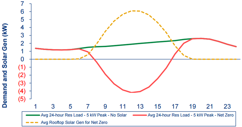 Based upon residential demand profile data from Southern California Edison and NREL solar production data for rooftop solar, we compared the hourly demand profiles of a home in Riverside California to the hourly demand profile of the same home with enough rooftop solar to displace its energy demand over the course of the year (Net Zero). The non-solar home in this example has a peak demand of 5 kW, and we determined it would require about an 8-kW south-facing rooftop solar system in order to be a Net Zero home.