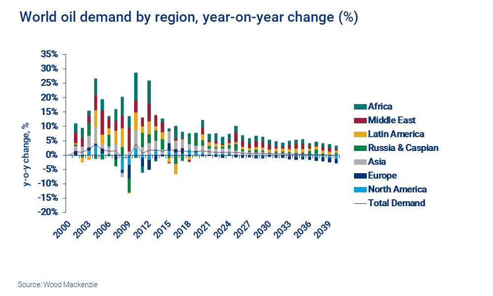 While demand for petrochemical feedstocks grows steadily, demand for transport fuels grows only slowly or even declines – a dichotomy that sharpens after 2030.