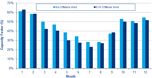 Although annual average performance looks good, an obvious insight from the above figure is that NYISO's assumption of high offshore wind performance during the summer is invalid. While winter months might see capacity factors of 50% or higher, the NYH average capacity factors from May through September are estimated to be well below the 38% reliability value. New York wind farms east of Long Island would average 28% in July and August. Therefore, even before looking at hourly data, it's obvious that NYISO should revise the summer offshore wind reliability value downward.