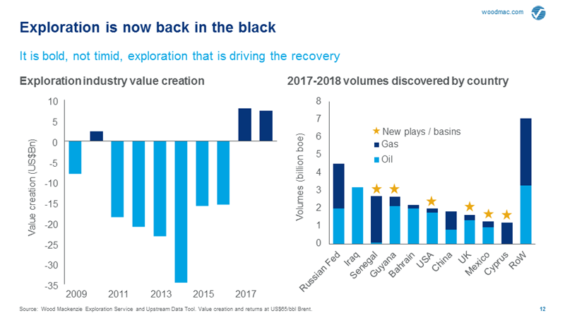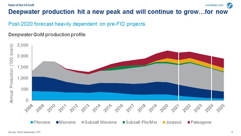 Oil price remains one of the most important, and difficult to forecast, factors in monetizing offshore projects. In the US GoM, we forecast Subsalt Miocene projects with expected FID dates in 2019/2020 to have development breakevens in the low to mid $40s (PV15, Brent). However, GoM Lower Tertiary projects expected to be sanctioned in the next few years have development breakevens ranging from the upper $40s to low $60s (PV15, Brent). Further sanctioning of these large offshore projects will require the industry to continue to innovate-with big data, supplier led solutions, and subsea technologies.