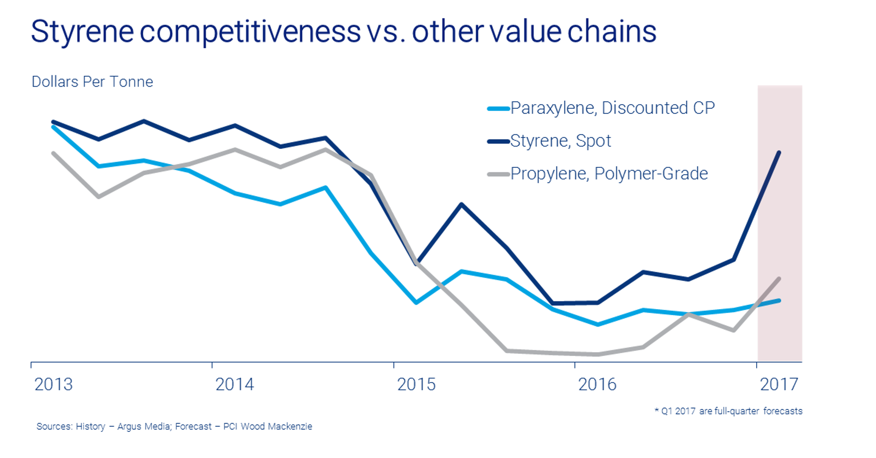 For example, styrene spot prices in the US Gulf Coast have jumped by over 50 percent since the end of 2016, leaving feedstocks somewhat behind and providing windfall margins for those producers able to capitalise.