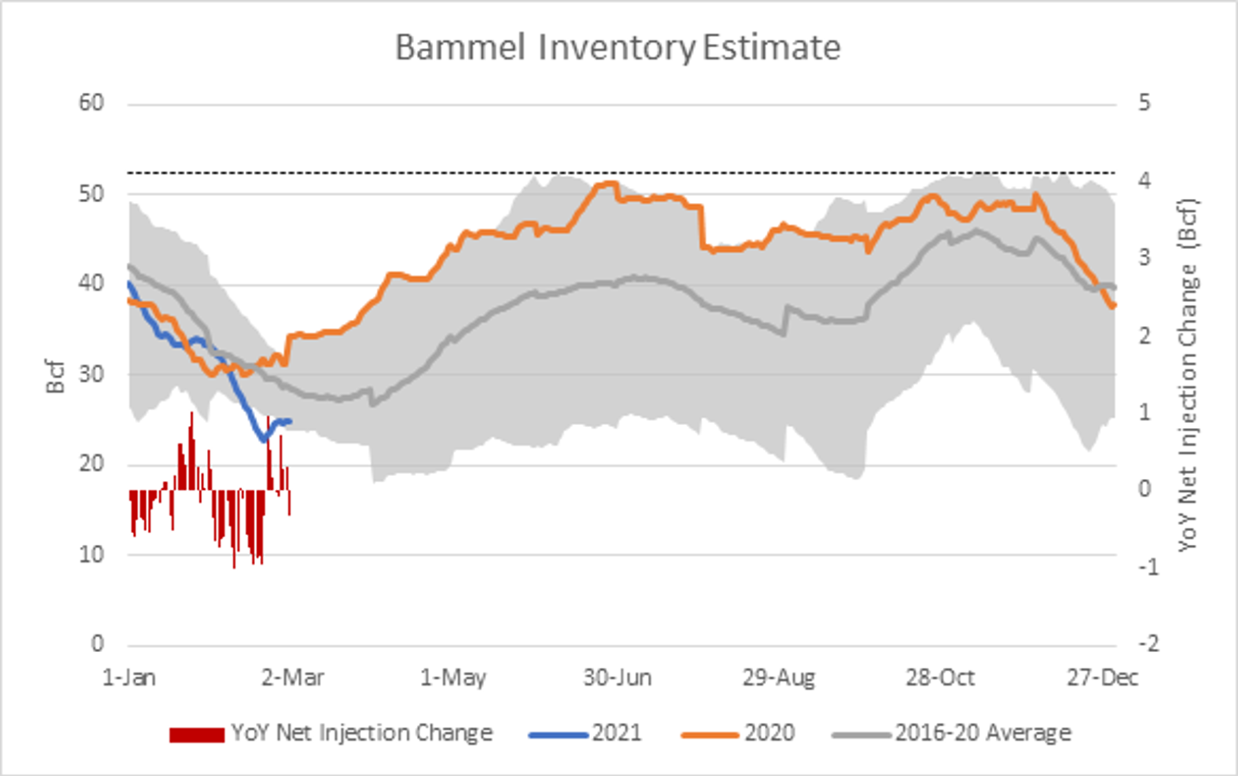 One important signal came from our proprietary Texas storage data, gathered from sensors and cameras placed strategically around the US energy infrastructure. Our monitoring of Bammel, N Lansing, West Clear Lake, Boling, Markham and Spindletop began to show near max draws at these key Texas storage facilities as early as February 10, indicating well ahead of other issues – production freeze-off supply losses, peak-of-cold demand and the unexpected Tres Palacios FM – that the market was already needing every molecule.