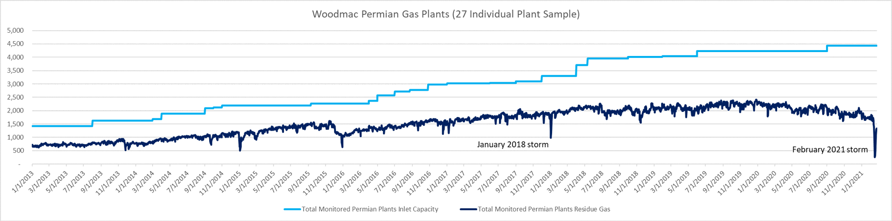 Among our total sample of 27 gas processing plants in the Permian Basin, throughput dropped by 85% in the peak of cold on 16 and 17 February. Our models show that Cimarex Permian production plunged by two-thirds during that week, from 1.2 bcfd to 450 mmcfd, before recovering to normal levels by 21 February. Matador and EOG production from the Delaware basin also dropped significantly, with gas flows at Matador’s Black River processing plant down 65% from early February highs.