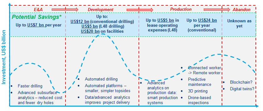 As we’ve said, energy firms are at different points in the digitalisation journey. Unconventional players in the US, driven by the overall cost competitiveness of that market, are probably the furthest along the path to realising the benefits of digital transformation. Conventional upstream has likely made the least progress, despite the size of the potential gains.