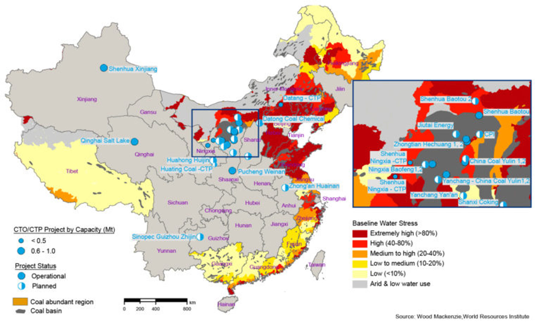 As CTO production requires a substantial 29 to 40 tons of water per ton of olefins production, water supply is a critical issue for the development of coal-based olefins. China's water resources are unevenly distributed in different regions, and adequate water supplies are not always in the same area as coal. China's Northwestern provinces such as Inner Mongolia, Shaanxi and Ningxia are home to an abundance of coal resources, but have minimal water access.