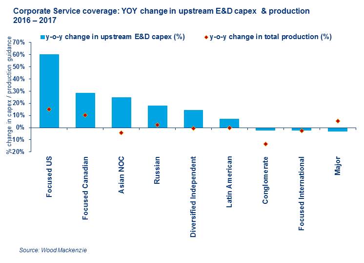 Of this US$25 billion increase, US$15 billion is from companies in our ‘Focused US’ peer group, which has a capex increase of 60% relative to 2016. This includes tight oil specialists such as Pioneer and EOG. Conversely, larger companies — including some Majors, ConocoPhillips, and ‘Focused International’ companies — plan to spend less in 2017 than they did in 2016. These are largely companies coming out of capital intensive phases of investment on conventional projects.