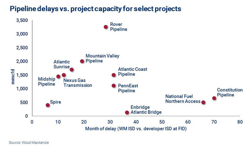 He has a point. We've tracked all proposed US pipeline projects for more than five years in our pipeline tracker, a part of the Wood Mackenzie North America Gas Service. The results were staggering. Since 2014, more than half of new interstate gas pipeline projects were postponed. That represents at least $36 billion in capex.