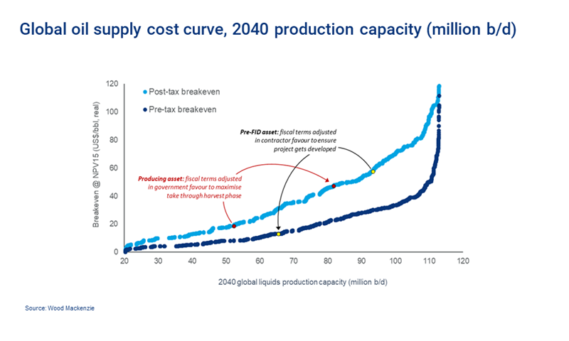 Where a company’s assets are located will be more important. We think about portfolio resilience on a post-tax basis, as things stand today. But evolving fiscal terms are a huge wildcard in all of this. The pre-tax cost curve looks very different. As the transition unfolds, some regimes will move to keep undeveloped barrels in the ground; others will do everything they can to get them out. Some will increase take through the ‘harvest’ phase; others may need to cede value to keep production flowing. Some will ban exploration; others will adopt Norway-style tax incentives.