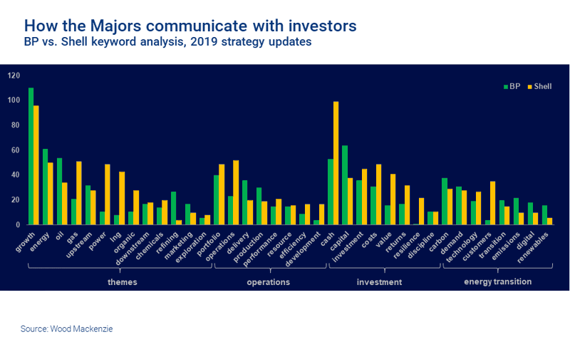 The Majors are very careful with their words. Every remark is considered, every message carefully crafted. Months of preparation go into showpiece strategy days – the most important date in any company calendar. So what are they saying, and what can we draw from it? In a complementary piece of research, Luke Parker considers the evolving strategies of Shell and BP from a different perspective: through the words they use when speaking to investors. He looks at the terms are they emphasising, how the messaging has evolved, and how the language of investor relations maps to strategy.