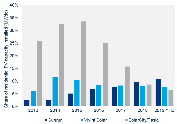 - Both Sunrun and Vivint Solar have now surpassed SolarCity/Tesla as the largest residential solar installers in the US.