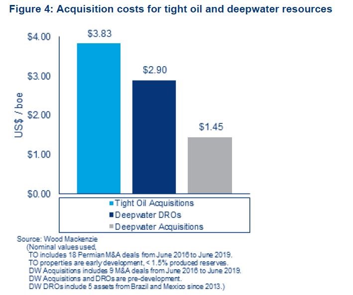 Most US tight oil and global deepwater acreage can be acquired for small signature bonus payments – but highly prospective acreage is expensive. At first glance, this comparison suggests that discovered deepwater resources are less expensive than tight oil. But this only tells part of the story.