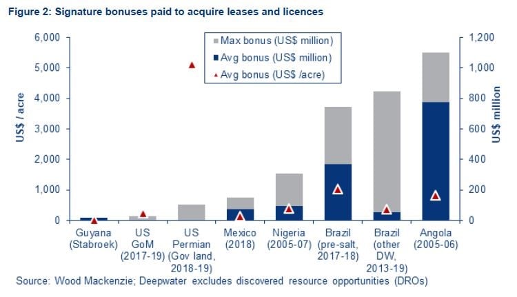 Deepwater licence areas tend to be several orders of magnitude larger than tight oil and bonuses payable are much lower on a US dollar per acre basis. But the actual sums payable can also be huge – hundreds of millions of dollars – with no guarantee that commercial production will result.
