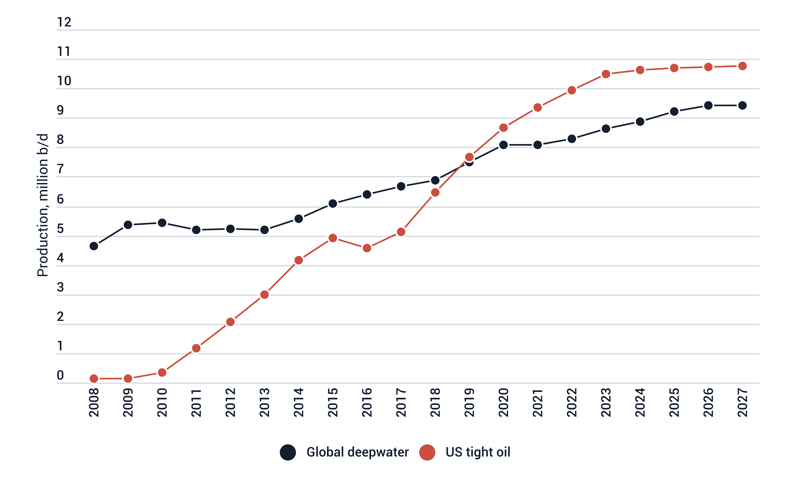 Global deepwater and US tight oil both produce around 7.5 million barrels per day. And each is poised for a sustained period of rising output.