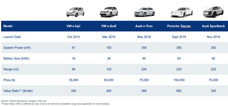 Volkswagen’s electric vehicle timeline shows continuous improvement of value to consumers. A decline in the vehicle-cost-to-range-ratio indicates improvements to production costs as well a system efficiency.