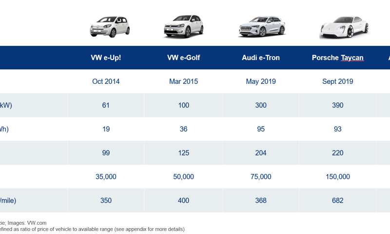 Volkswagen’s electric vehicle timeline shows continuous improvement of value to consumers. A decline in the vehicle-cost-to-range-ratio indicates improvements to production costs as well a system efficiency.