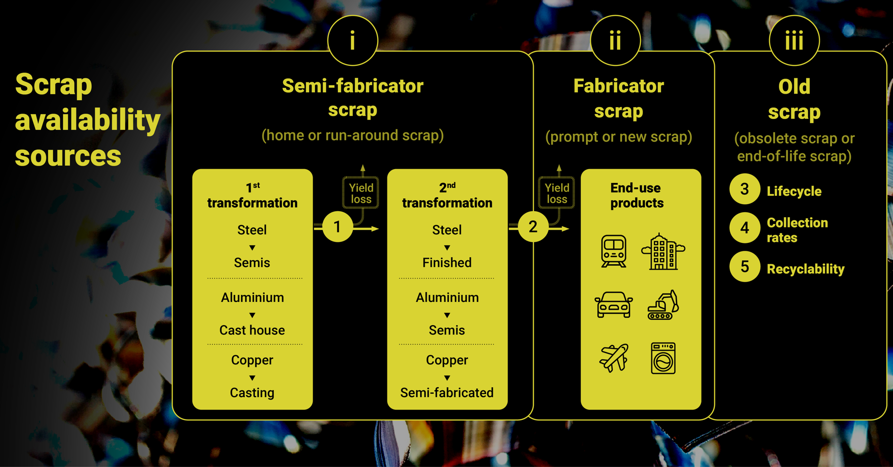 To illustrate the global scrap story, take the humble laptop. It contains an average of around 20g of steel, 40g of aluminium and 140g of copper. Some material is lost in the metal and then the laptop production processes, contributing to semi-fabricator (1) and fabricator (2) scrap. What’s more, because of policy considerations, your laptop is already designed with its recyclability (5) in mind.