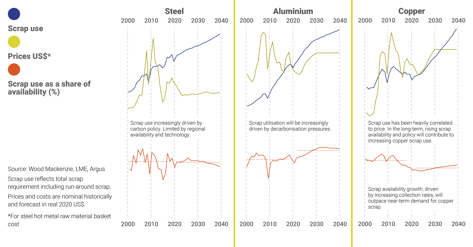 Consumer and investor pressures – demanding recycled content – could transform the market but it will not happen until incentives are compelling and quality can be maintained. Policies that mandate greater recycling rates are already driving cleaner and more reusable scrap collection. Furthermore, policies on minimum recycled content could spur demand for scrap. In addition, we believe that governments will increasingly see scrap as a strategic source of low-carbon domestic supply with significant growth potential.