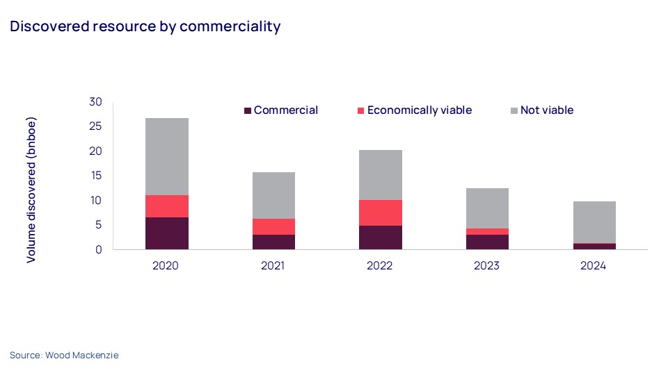 Exploration performance in 2024 was marked by a reduced well count and the lowest number of discoveries in a decade. Only a small proportion of the resources discovered were considered commercial or viable.
