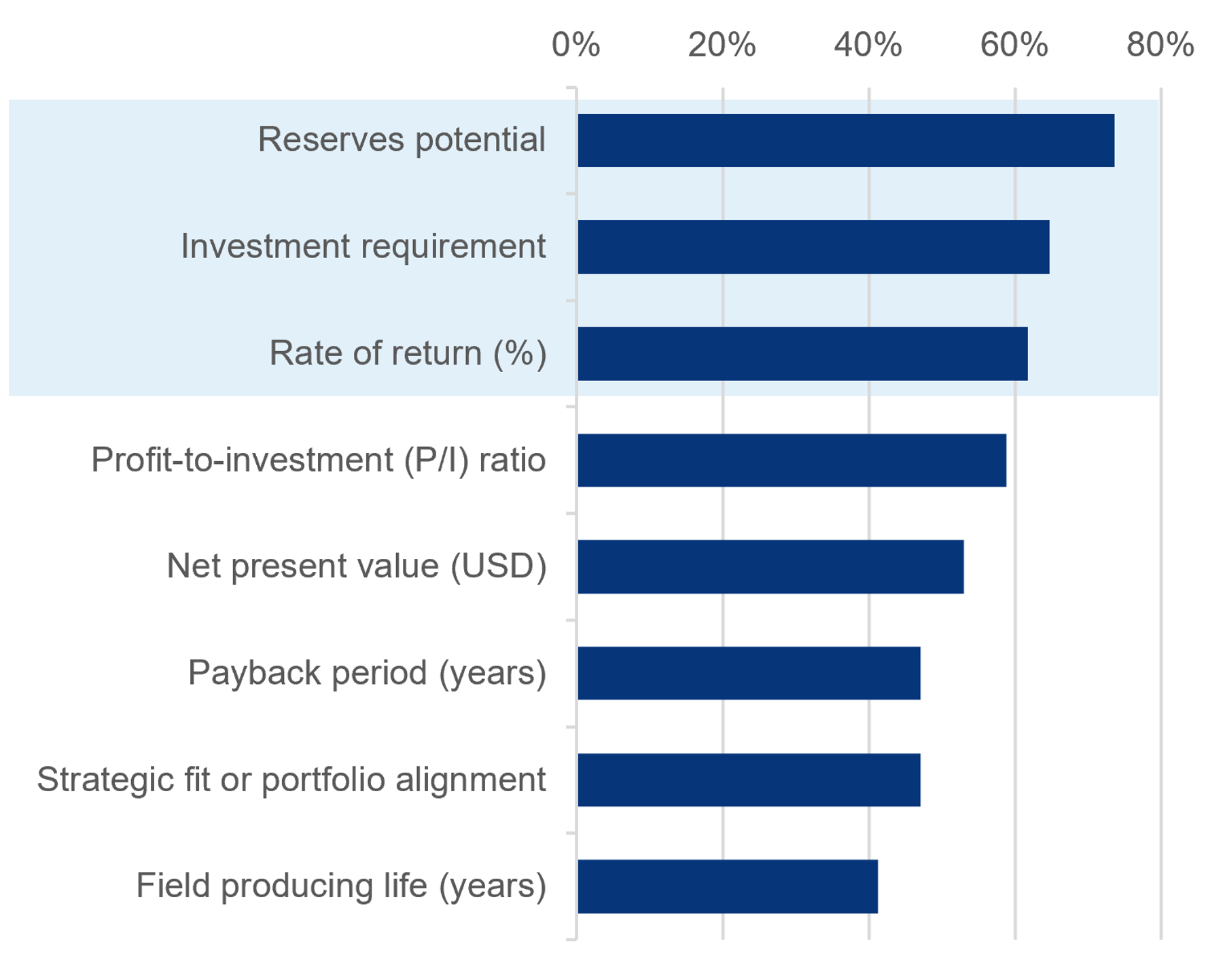 Over two-thirds of respondents revealed that their organisation expects a rate of return of over 15%; our analysis shows that 37 fields fit the bill. Furthermore, almost a third of respondents expect returns above 20%; only 29 fields exceed these higher expectations. Taking into consideration the initial capital investment, there are 22 fields with +20% returns that will require up to $200m before first oil and gas. Of these, 12 fields have remaining resources of more than 10 mmboe.