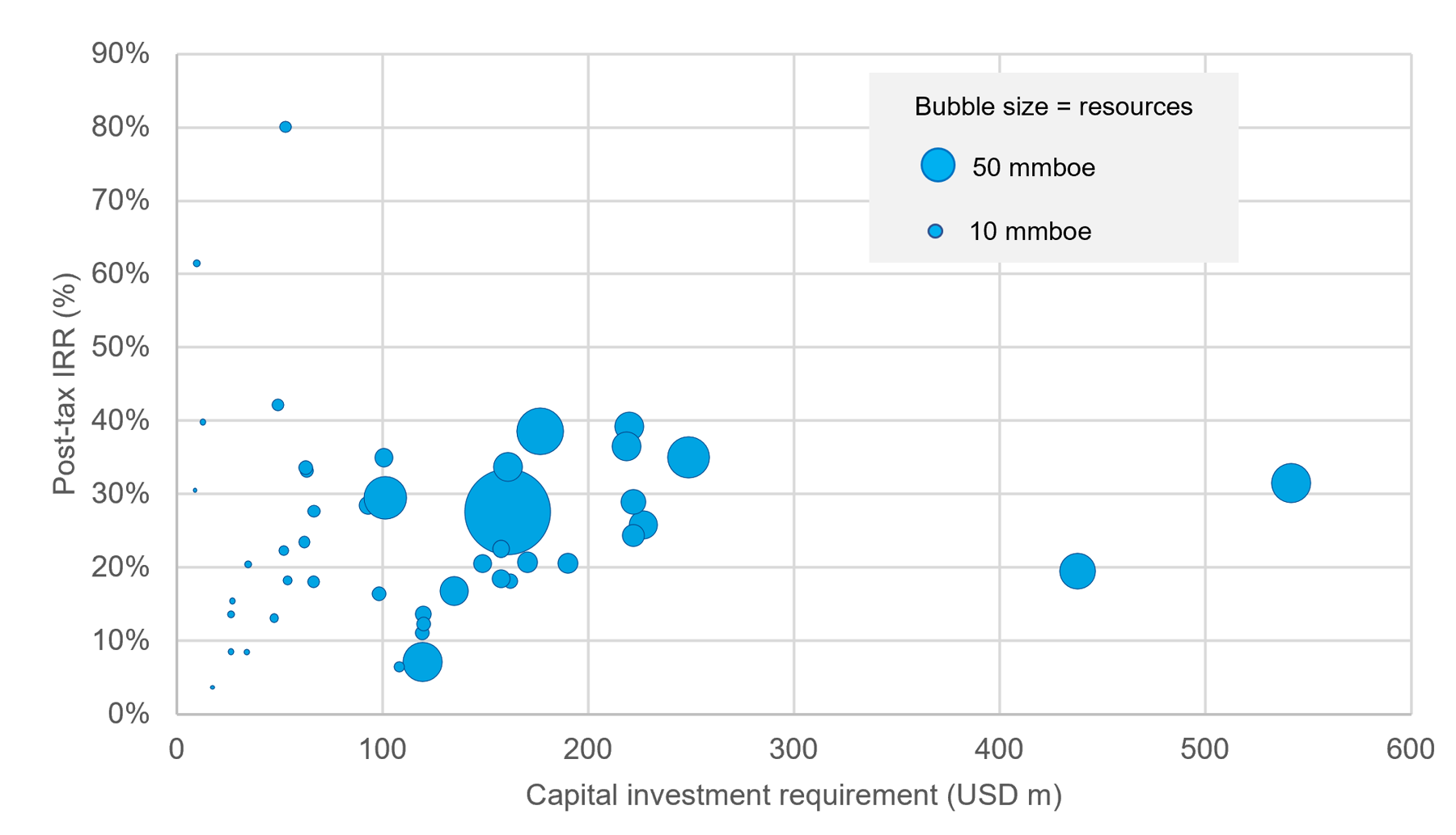 Figure 2 plots the marginal fields using the three most important investment criteria: post-tax investment returns on the vertical; capital investment requirements to first oil and gas on the horizonal; and remaining resources as the bubble size. (The sweet spot for most investors, based on our survey, is the top-left.)
