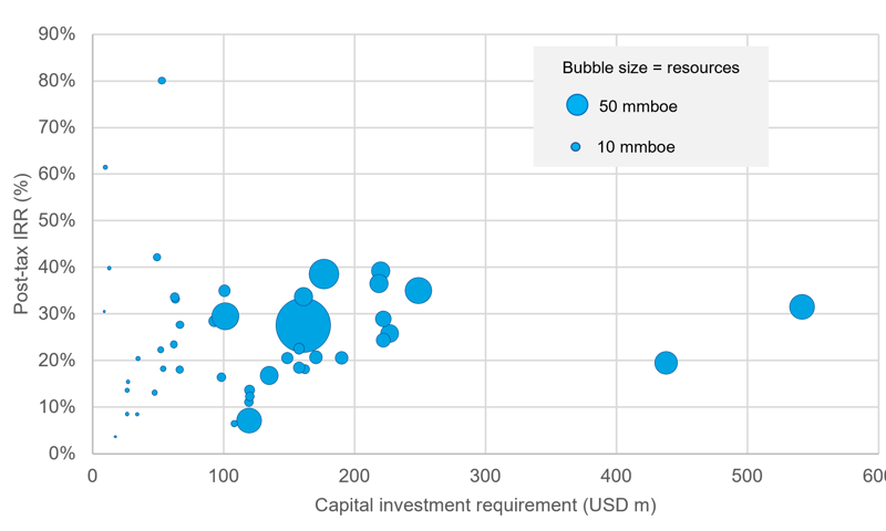 Figure 2 plots the marginal fields using the three most important investment criteria: post-tax investment returns on the vertical; capital investment requirements to first oil and gas on the horizonal; and remaining resources as the bubble size. (The sweet spot for most investors, based on our survey, is the top-left.)
