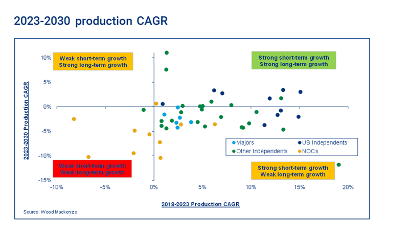 So what does four years of cherry-picking, low conventional resource renewal and the rise of tight oil mean for the peer group’s production? Most companies look good in the short run with production growth out to 2023. But some face a pressing challenge in the next few years. And beyond 2023, most companies enter production decline.