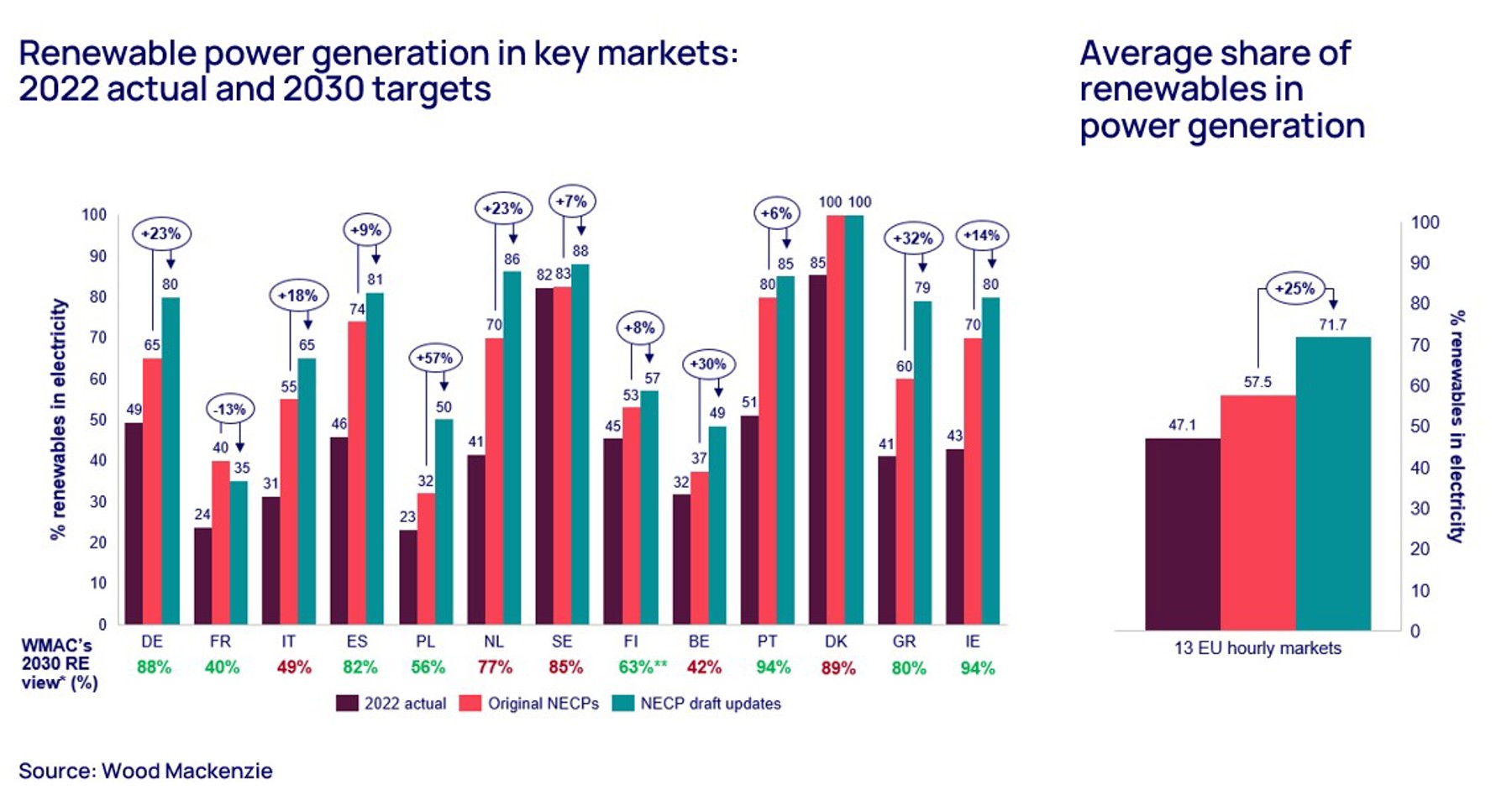 Targets for renewables in power average 72%, up from 63% in previous plans. Our forecasts for 2030 broadly aligned with these submissions, except for Italy, which we forecast to miss its target by a significant margin.