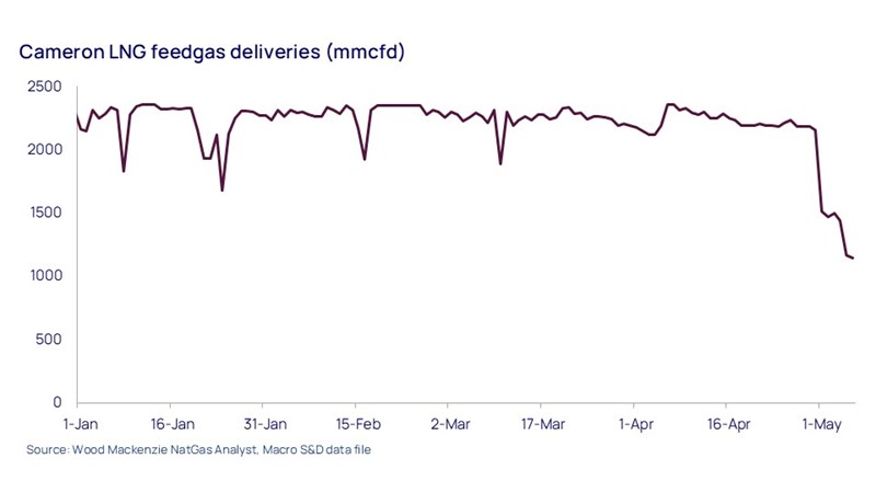 View Daniel Myers's full profileCameron LNG’s Train 1 went offline for maintenance on 1 May, leading to a significant drop in feedgas flows to the terminal, now below 1.2 Bcfd compared to the year-to-date average of 2.2 Bcfd. This event coincides with scheduled maintenance on the Cameron Interstate Pipeline, which is expected to limit flows to about 270,000 MMBtu from 5 to 8 May.