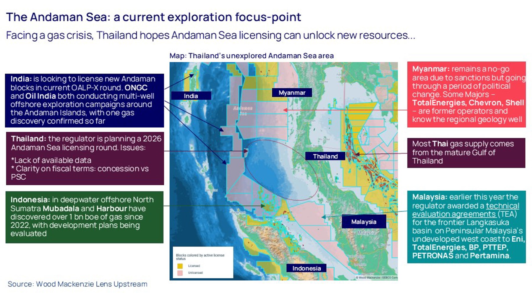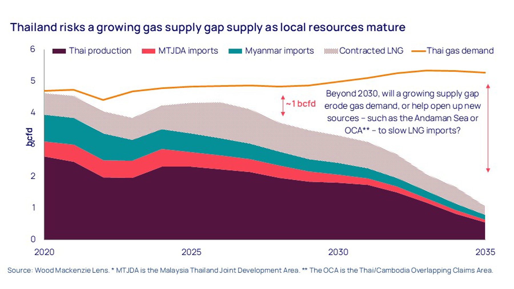 - The Thai government hopes that licencing its interests in the Andaman Sea and/or the Thai/Cambodia Overlapping Claims Area (OCA) can unlock new gas resources to lessen reliance on imported LNG.
