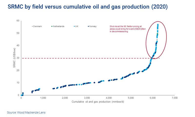 In the short term, the North Sea can survive; 95% of onstream production is ‘in the money’ at US$30/bbl. But close to a quarter of fields will run at a loss in this price environment. The major concern here is not volumes. Early shut-ins would accelerate US$20 billion in decommissioning spend.