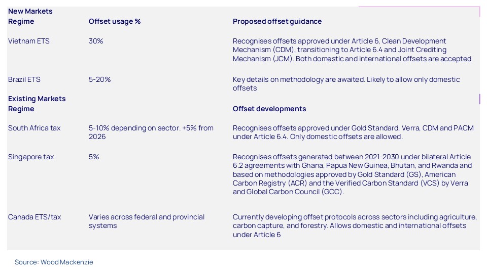 Vietnam’s pilot emissions trading system (ETS), launching in August 2025, aims to allow up to 30% offset usage, with full implementation expected by 2029. Brazil has proposed to allow 5-20% of offset usage under its upcoming ETS. Singapore already allows 5% usage of offsets under its carbon tax and has now allowed usage of offsets from projects under Article 6.2 following several recent bilateral agreements.