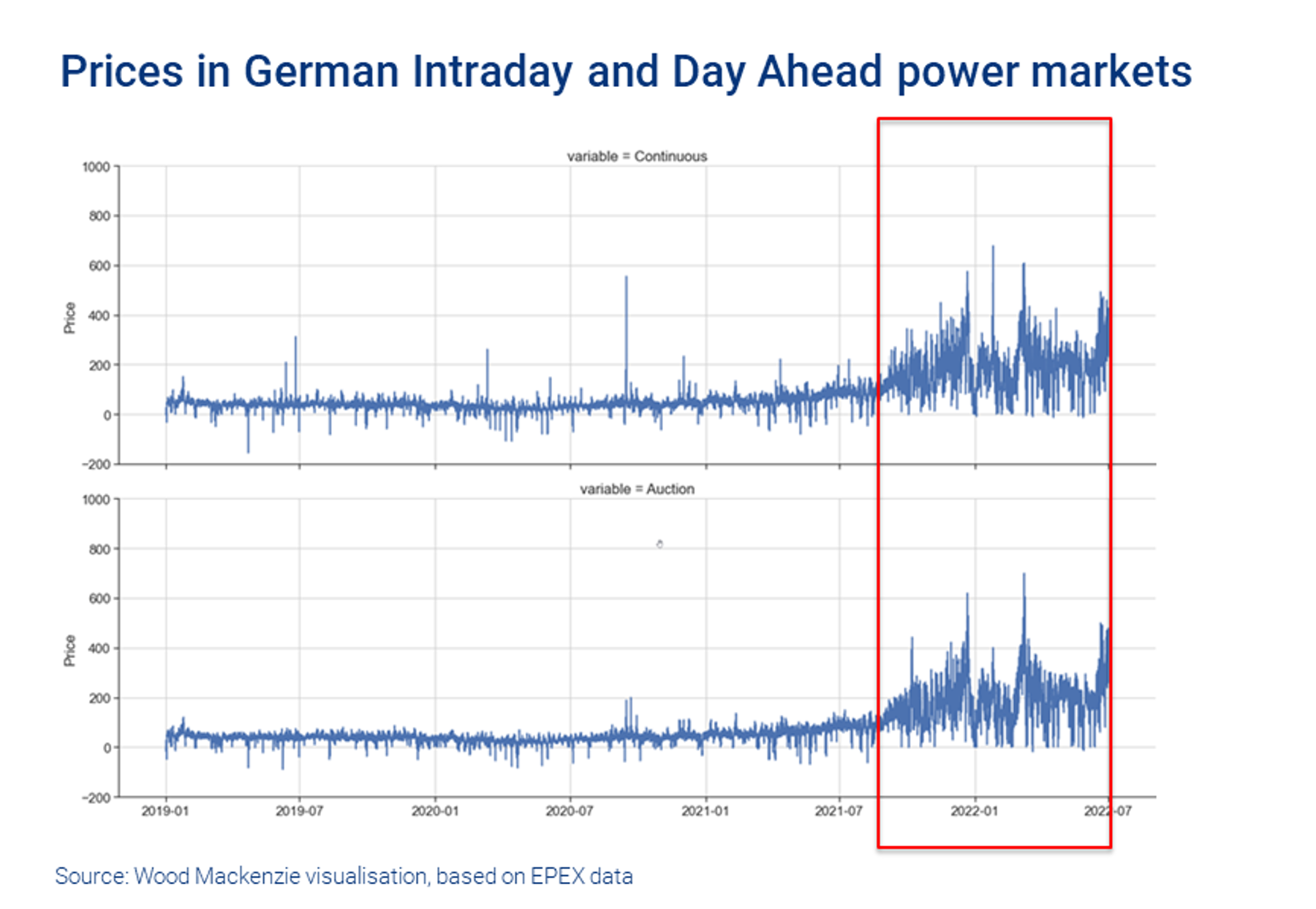 Electricity prices in the German Day Ahead (DA) auction and Intraday (ID) continuous electricity markets have been rising since autumn 2021. We have also seen a clear growth in volatility, with an increasing variation-band of hourly prices recorded every day. This new phase is highlighted in red in the chart below.