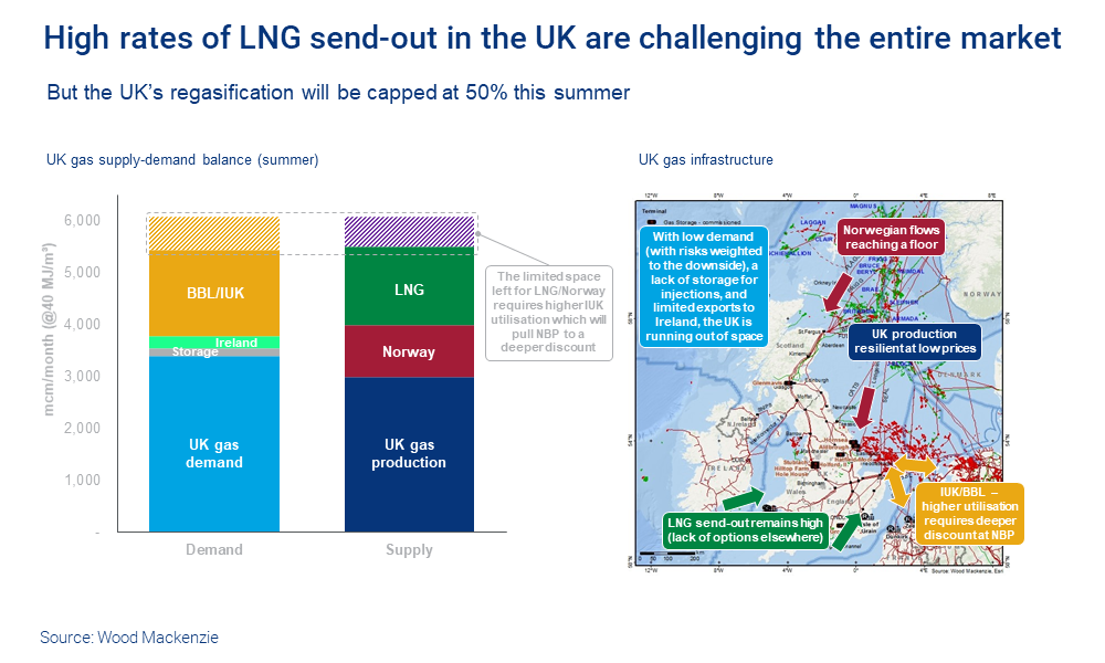 Compounding matters, the UK has very limited storage capacity for injections and is approaching the limits on its ability to export volumes into neighbouring markets. Put simply, the UK market is running out of space.