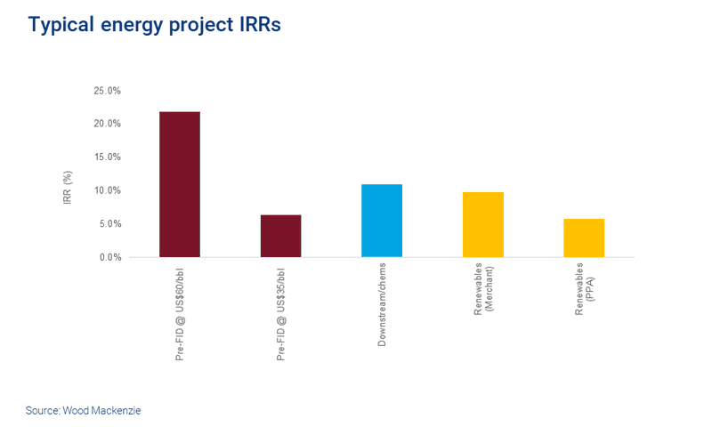 At US$60/bbl, solar and wind assets – with average returns of 5-10% IRR – have found it difficult to compete with expected double-digit returns for oil and gas. But at the current oil price, returns from oil and gas are now in line with what investors can expect from low risk solar and wind projects.