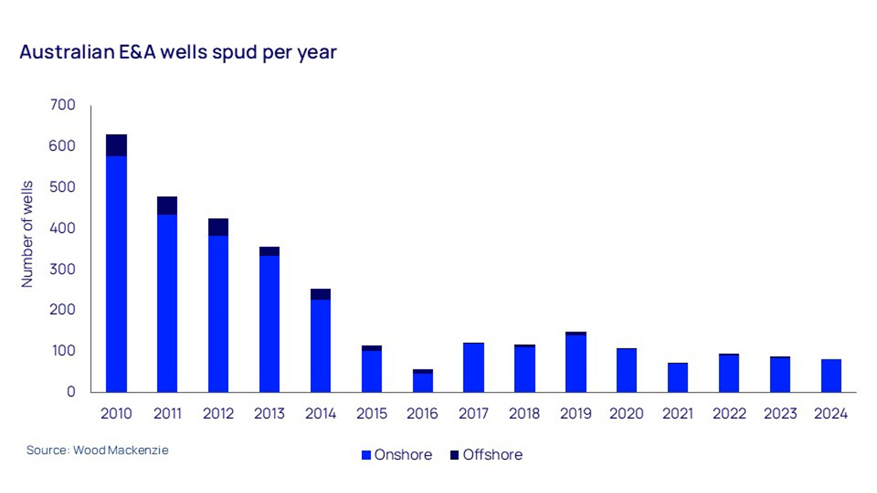 Despite the continued importance of gas in Australia’s energy mix, and higher prices, new gas supply and exploration projects have been delayed. The following chart illustrates the shift in exploration activity.