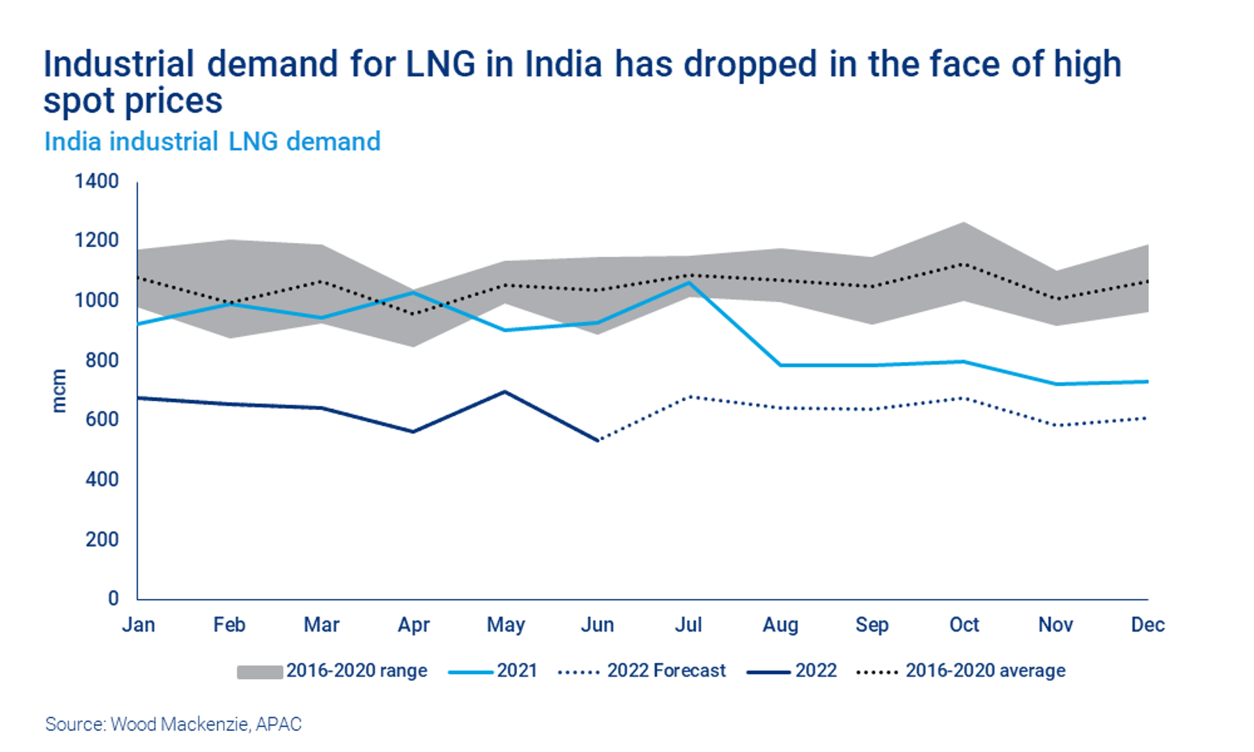 In South Asia, oil is the primary substitute for gas in key sectors. India has reduced LNG usage by 30 to 40% year-on-year in refineries and petrochemical plants. Large-scale industries have replaced LNG with domestic gas, produced in India’s eastern offshore. And other small industries are switching to fuel oil and liquefied petroleum gas (LPG) for heating. Replacing captive power generation with coal-dominated grid-based power has also offered some savings.