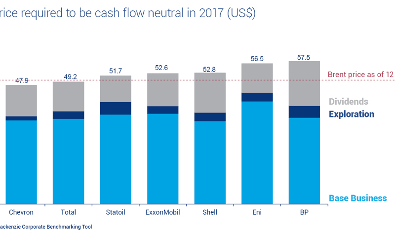 Aggregate upstream earnings for the majors were US$8.3 billion in Q1, a dramatic improvement on the losses of US$2.9 billion in Q1 2016. However, even with this quarter's strong showing, upstream still has an average cash flow neutral breakeven of around US$50. This is uncomfortably close to the average Brent price last quarter and leaves upstream vulnerable to future shocks.