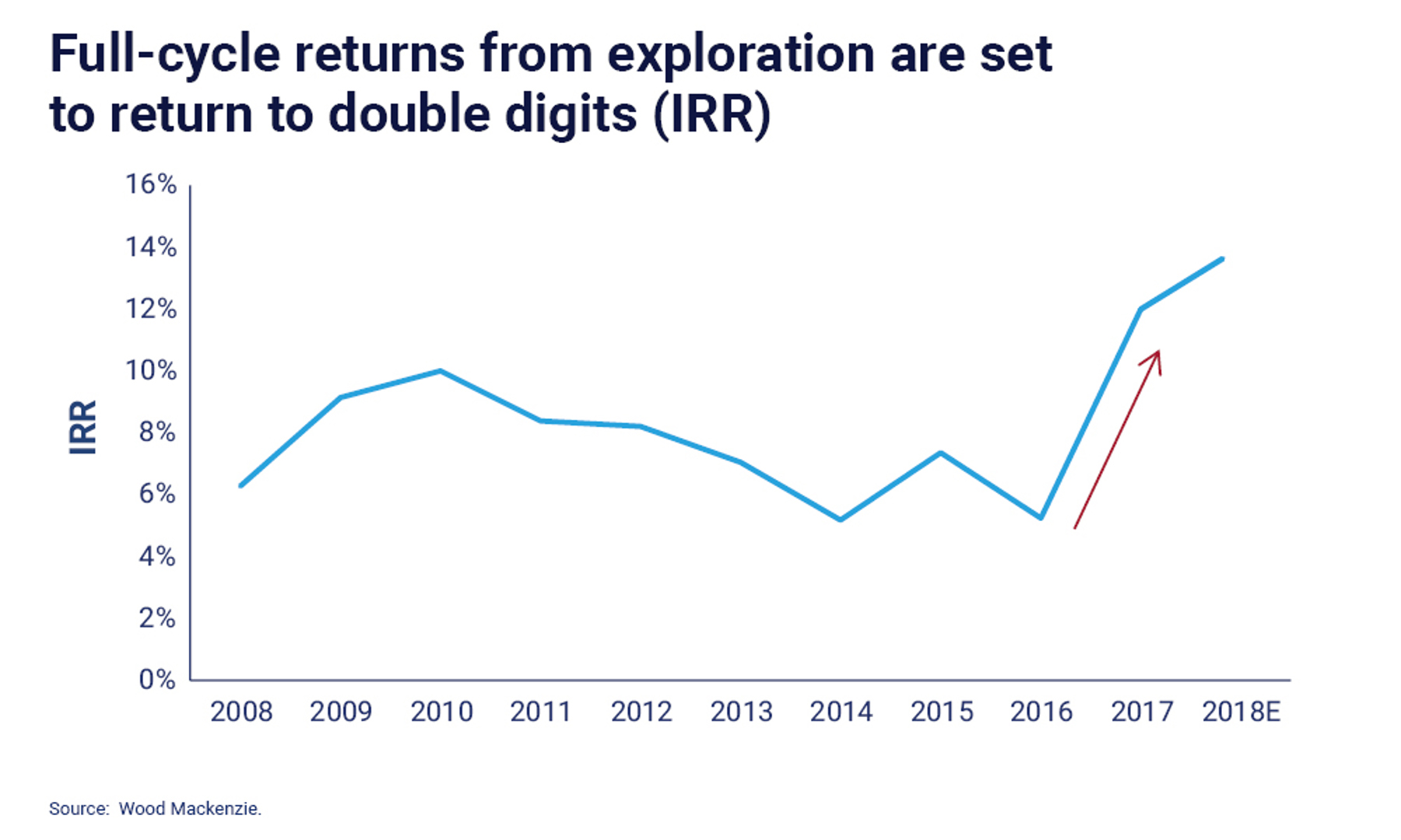 Things are looking up for exploration as we start to see a long overdue return to profitability - for those companies still in the game. From single digit returns just a couple of years ago, we're now headed back to double-digits. Many exploration costs have halved versus their 2014 peak, helped by quicker drilling of most wells.