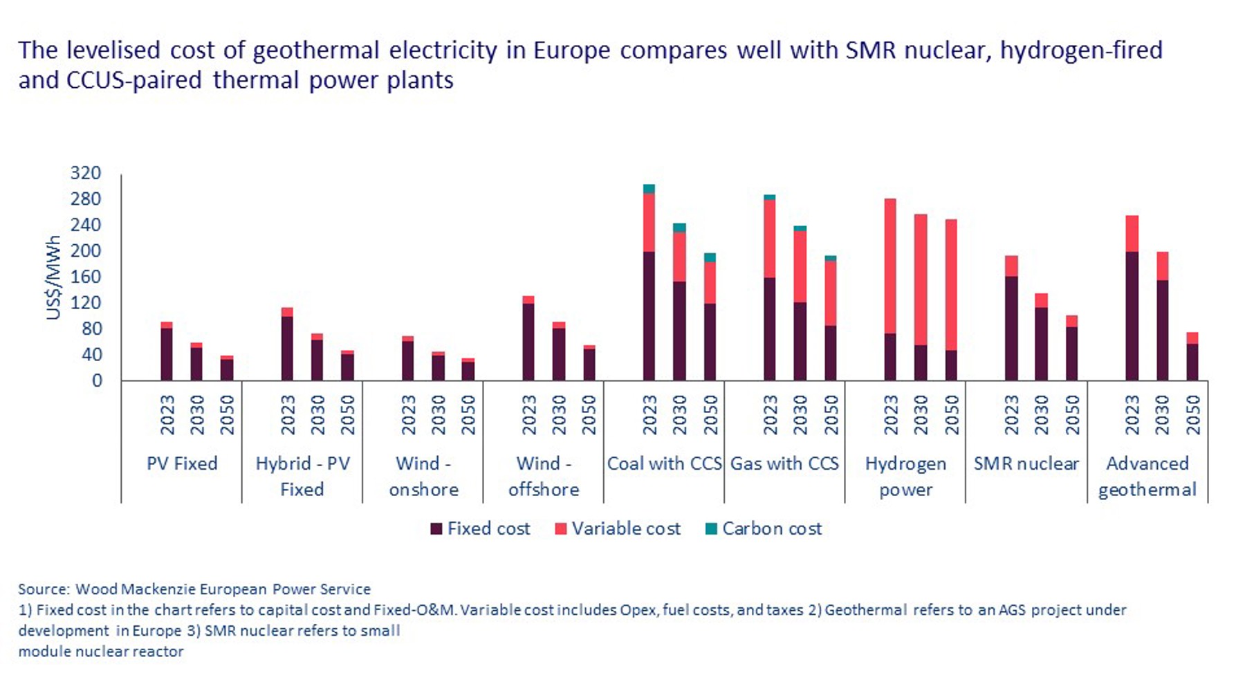 This comes from a recent paper on geothermal energy by Wood Mackenzie’s Andrew Latham and Prakash Sharma. It shows comparisons of the levelised cost of electricity for a variety of low-carbon technologies, today and in 2030 and 2050. Advanced geothermal, over on the right-hand side, is clearly today much more expensive than solar and wind, even offshore wind. But compared to some other sources of “clean firm power” – dispatchable zero-carbon generation – such as hydrogen and fossil fuel plants with carbon capture, it is already competitive.
