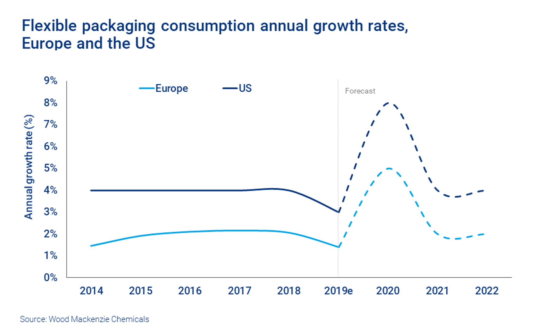 After a disappointing 2019 in both regions, we expect to see US demand for consumer flexible packaging increase by high single digits this year, compared to 3% in 2019. In Europe, demand growth fell back to under 1.5% in 2019, but could climb to above 5% this year.